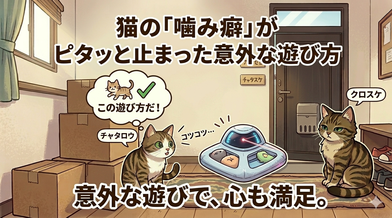 わが家のクロスケも、以前はかなりの「ガブガブ職人」でした。でも、ある「意外な遊び方」を検証してみたところ、あんなに攻撃的だった噛み癖が、今では驚くほど落ち着いたんです!