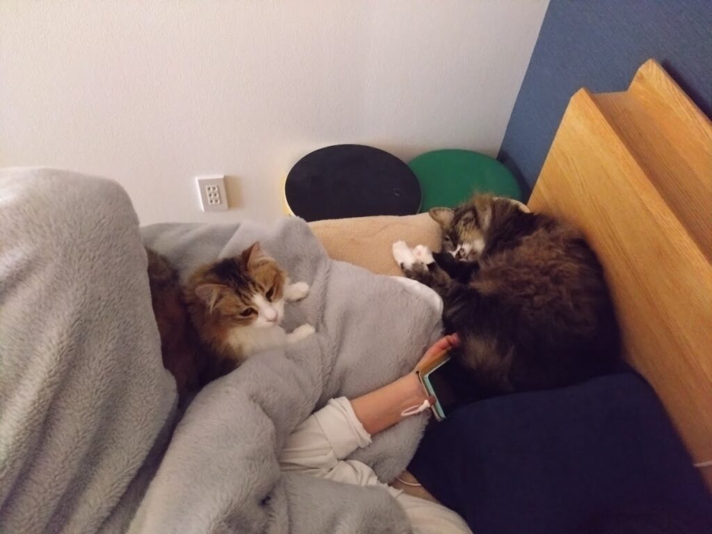 夜、飼い主くんが布団に入ると、さっそく二匹がやってきました。