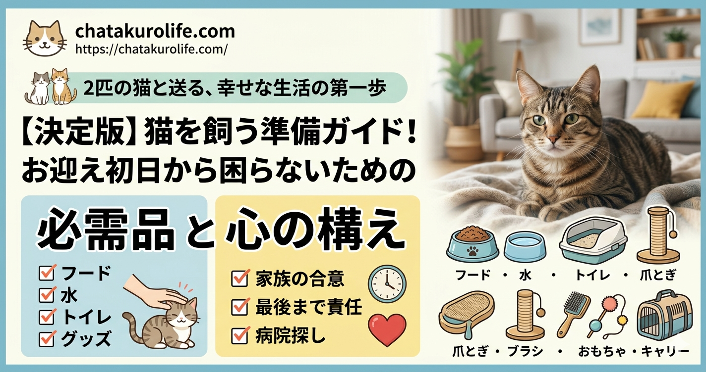 今回は、わが家の元気いっぱいなチャタロウと、超慎重派なクロスケをお迎えした時の飼い主くん(私)の体験談を交えながら、猫を飼うための準備を完全網羅して解説します!