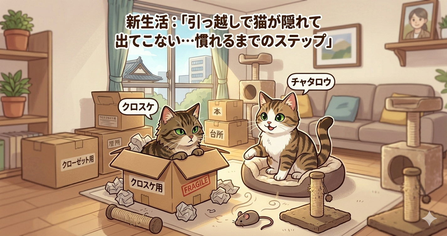 「ごはんも食べないし、トイレも我慢しているみたい…」と焦る気持ちはよく分かります。しかし、ナワバリ意識の強い猫にとって、引っ越しは人生最大級のストレスイベント。まずは、わが家の2匹、慎重派のチャタロウと、マイペースなクロスケの会話から、彼らの本音をのぞいてみましょう。